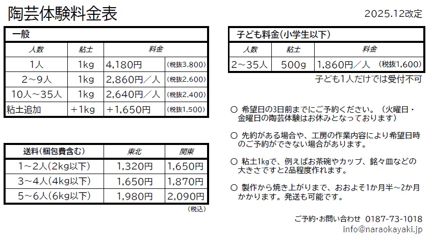 ● 陶芸体験は秋田冬アソビ割の対象になっております。クーポンを利用した予約はアクティビティジャパンの予約サイトからお願いします ● 陶芸体験のキャンセルポリシーを明記いたしました ● 12月1日より陶芸体験の料金を改定いたしました。改定後の料金表はこちら ● 年末年始のお休みは12月31日(水)〜1月6日(火)です。12月30日(火)は午前中のみ営業いたします ● 1月16日(金)は都合により臨時休業いたします ● 楢岡焼をイメージしたルアーを製作・販売されている方がおります[instagram][shop]